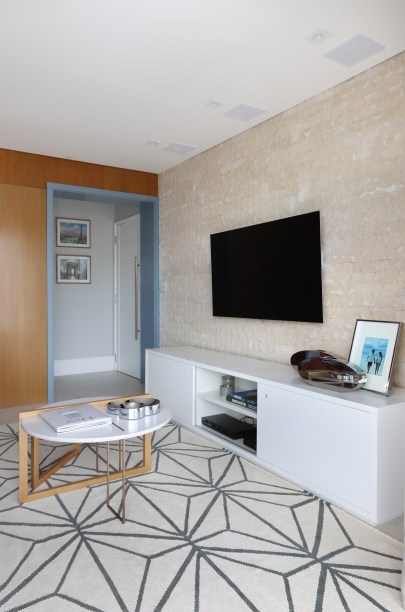 A primeira intervenção foi unir a sala e a cozinha, mas o casal não queria que o ambiente ficasse sempre aberto. “Sugeri a execução de um painel de madeira com portas de correr que ficassem embutidas nele, assim eles conseguiriam abrir e fechar conforme sua necessidade”, explica Gabriela. No ambiente de preparo, chama a atenção a paginação inusitada do ladrilho hidráulico que deixa a cozinha super contemporânea.