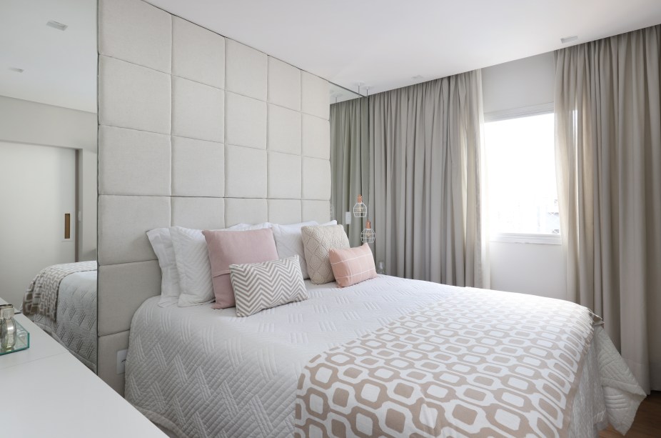 Já na área íntima da casa, o projeto derrubou as paredes do banheiro de serviço e ampliou o banheiro principal da suíte. Ali, uma cabeceira de tecido dá o tom clássico e garante a elegância. O closet, super organizado, é resultado de um projeto a quatro mãos. Como a moradora é personal organizer, ela arregaçou as mangas e, ao lado de Gabriela, criou armários, gavetas e nichos ideais para guardar seus pertences.