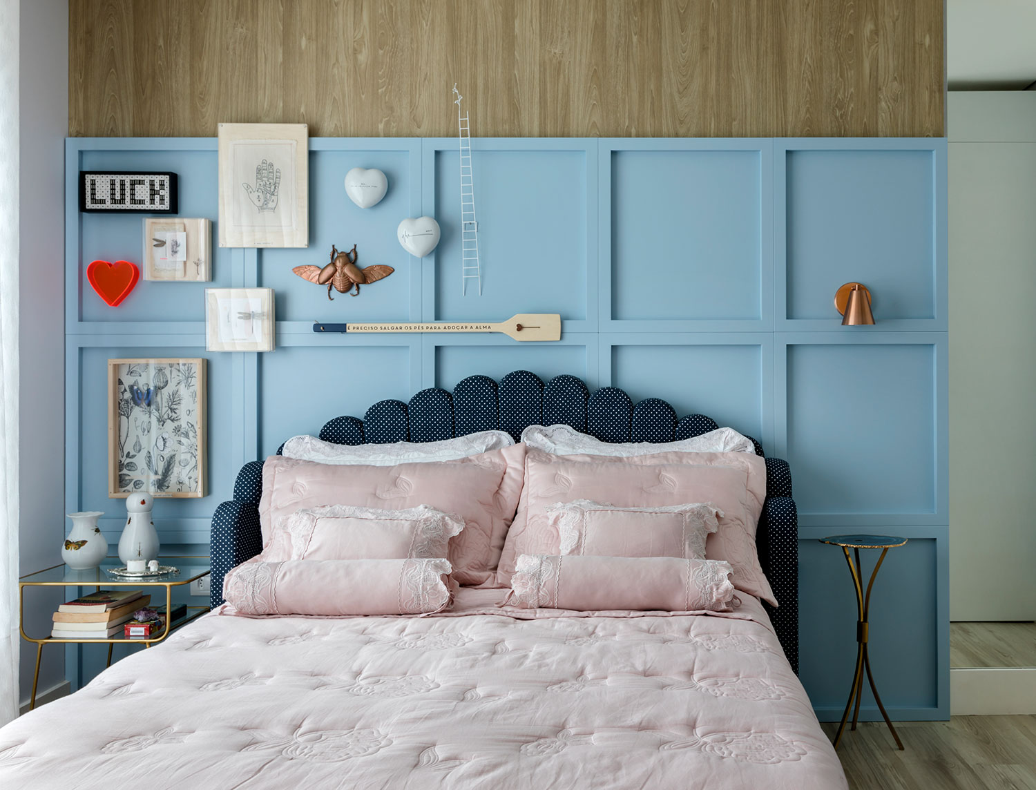 Porém, o destaque vai para o quarto da adolescente. Nele, uma cabeceira azul envelopa metade da parede e recebe diversos itens decorativos e de design, que finalizam e trazem todo o charme do espaço.