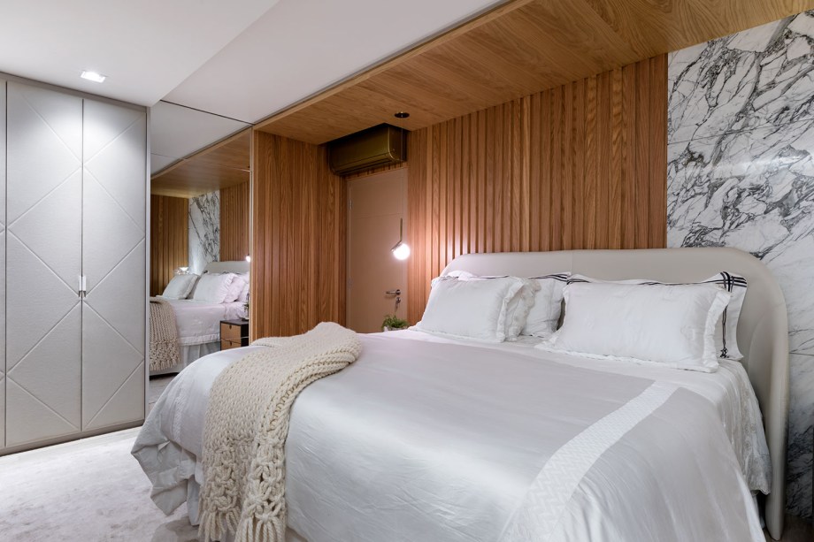 A suíte master possui uma variação encantadora de texturas em tons de fendi, que vai dos painéis e armários com portas estofadas às tramas das cortinas. Para trazer mais calor a esse ambiente, foi usada uma moldura de madeira carvalho envolvendo a cama do casal, resultando em um quarto que “abraça”.