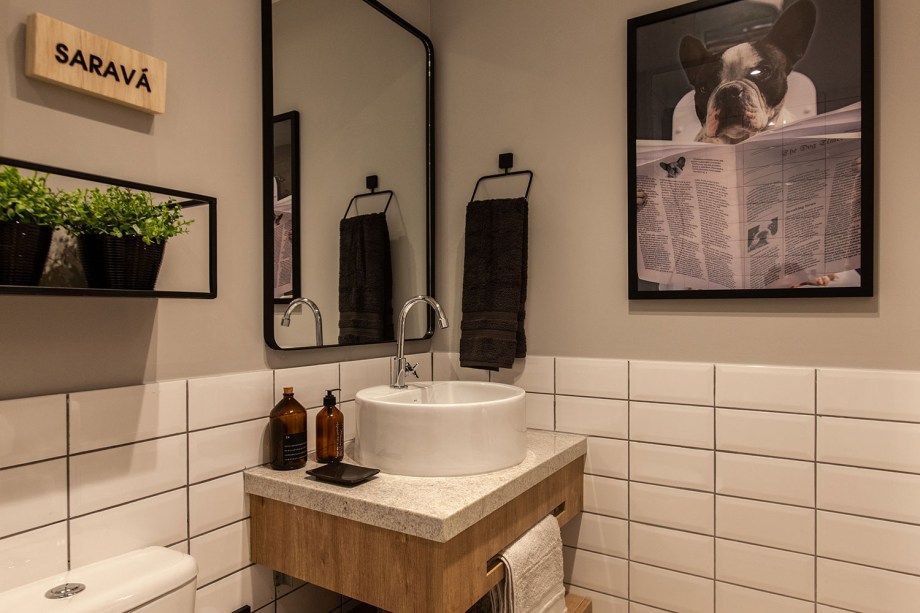 Mas o queridinho do projeto é o banheiro que, por ser o único do lar, acaba funcionando também como lavabo. “Usamos o tijolinho branco com rejunte escuro para deixar mais descolada a proposta. Escolhemos ele por ter um ótimo custo benefício e acrescentamos objetos decorativos para valorizar a proposta”, explicam.
