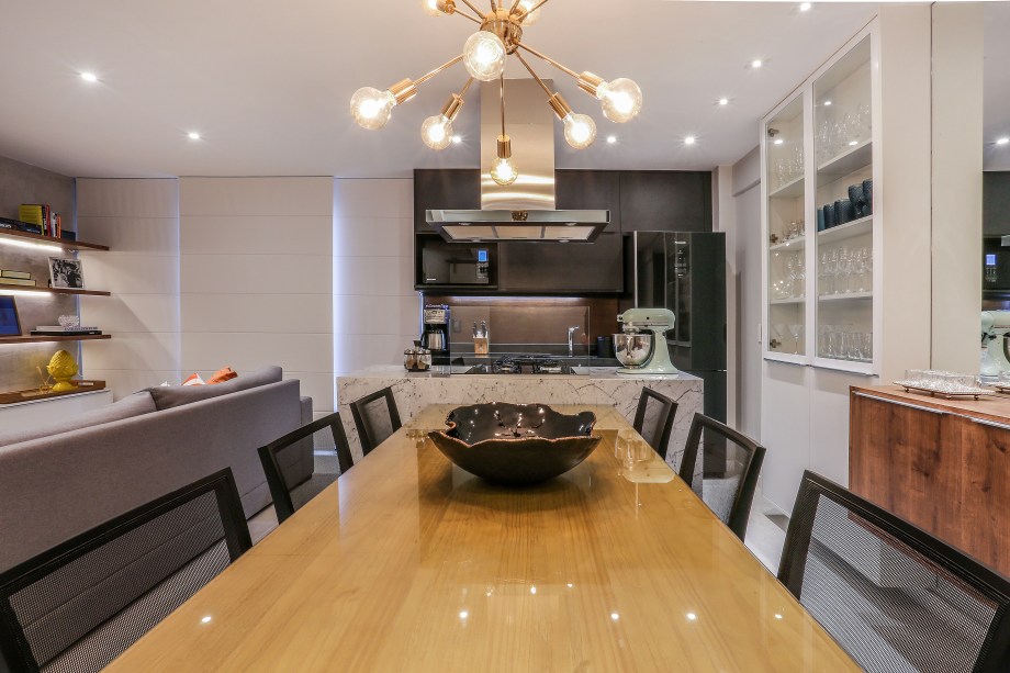 A sala, integrada à cozinha sem a perda do conforto, traz o bom uso da iluminação para criar cenários bem definidos e ampliados. No mesmo ambiente, o cimento queimado da parede garante um toque industrial, que conversa com as solicitações dos moradores.