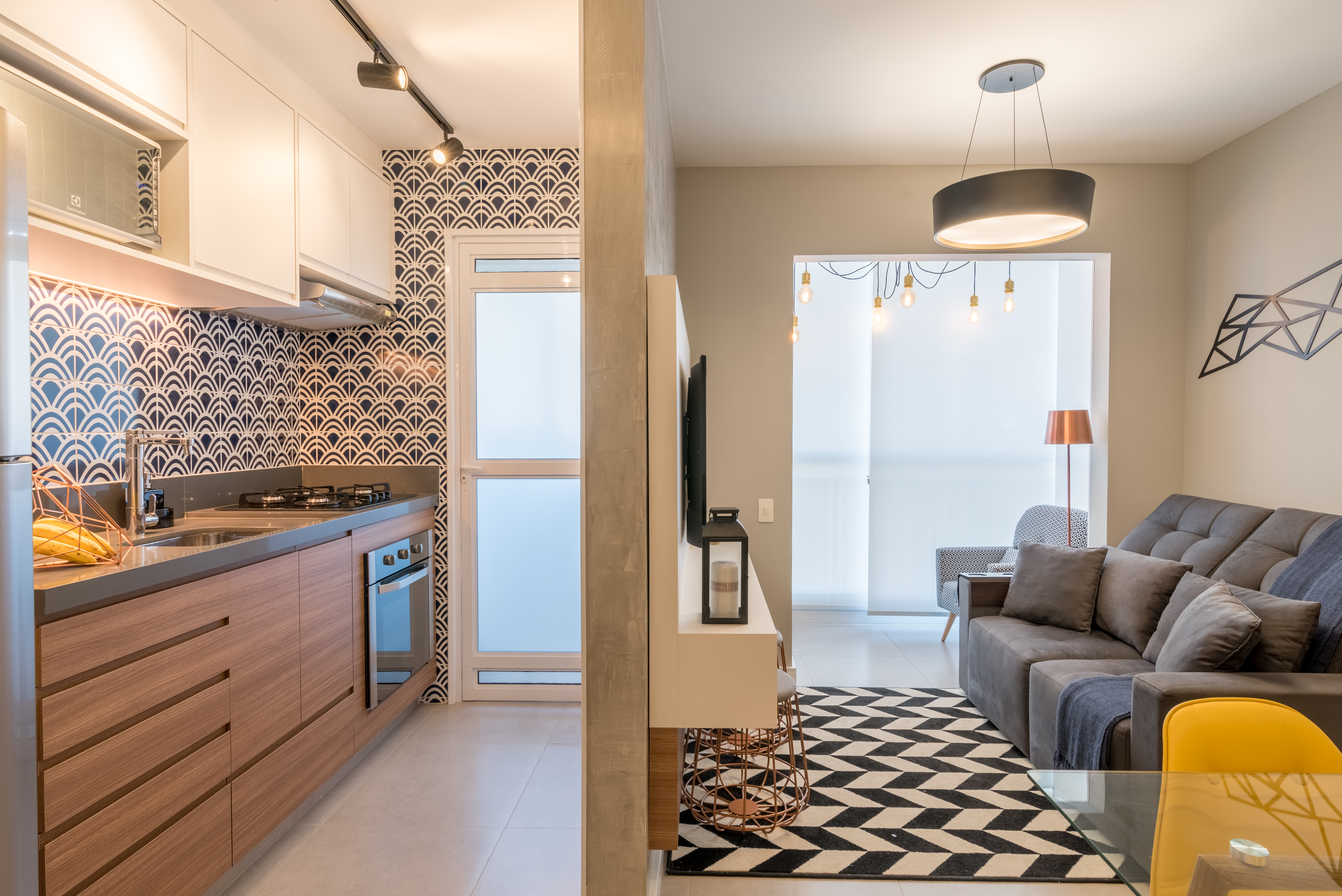 Para este apartamento de metragens reduzidas no Morumbi, em São Paulo, o Studio 19 Arquitetura elaborou um projeto com foco na integração dos ambientes, como sala, cozinha e varanda. Quando somados, os cômodos resultaram em um espaço amplo e agradável para receber as visitas.