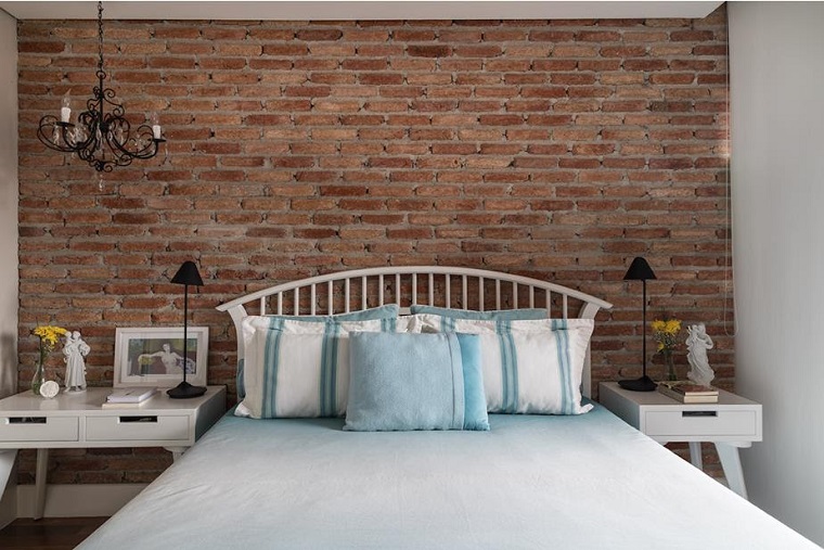 Dessa vez, a arquiteta buscou uma atmosfera rústica e um contraste de materiais entre o revestimento da parede e o mobiliário de laca branca. Para revestir a parede principal, segundo ela, os tijolos de demolição foram cortados pela metade, um a um. O resultado foi um quarto super confortável e cheio de personalidade.