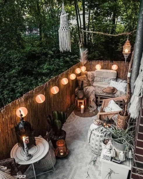 Com isso em mente, reserve um cantinho da sua varanda para que você possa colocar cadeiras confortáveis com cobertores e almofadas; luzes de fada; velas e muitos elementos em tons neutros – para trazer calma e aconchego. O lugar perfeito para tomar um vinho com o crush e ficar conversando a noite inteira.