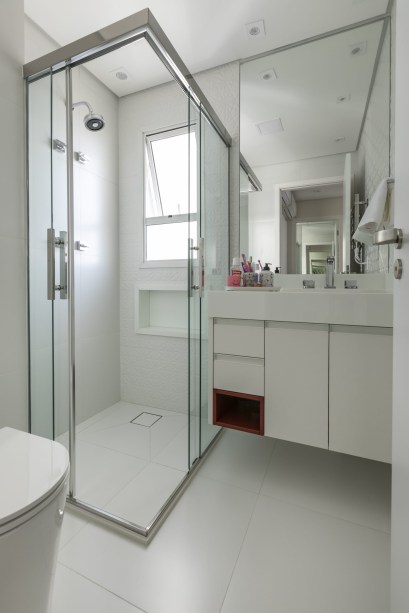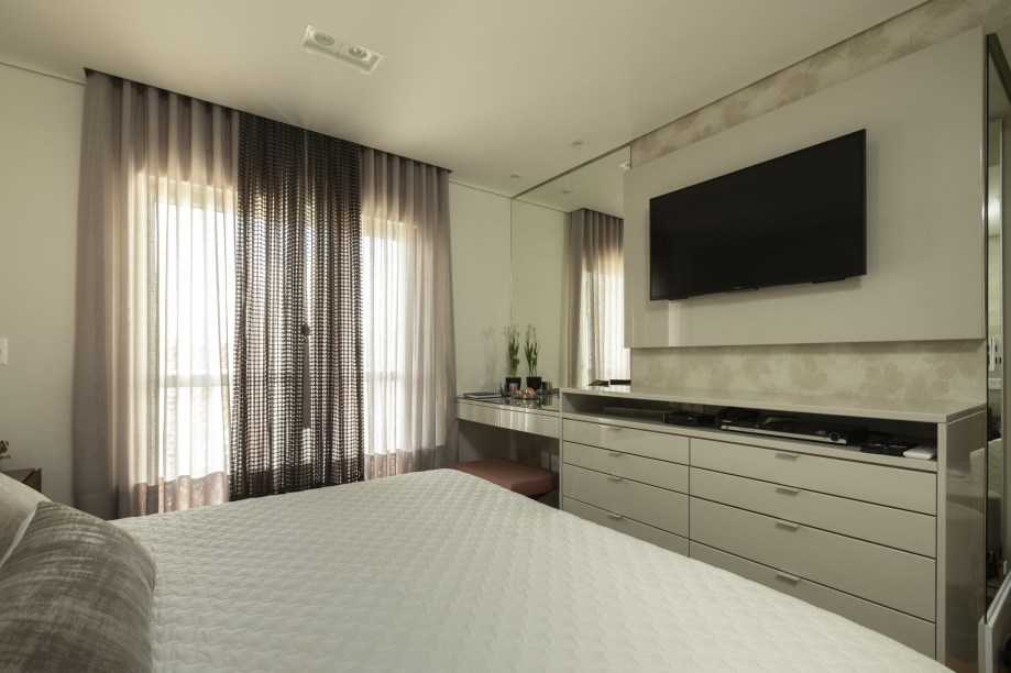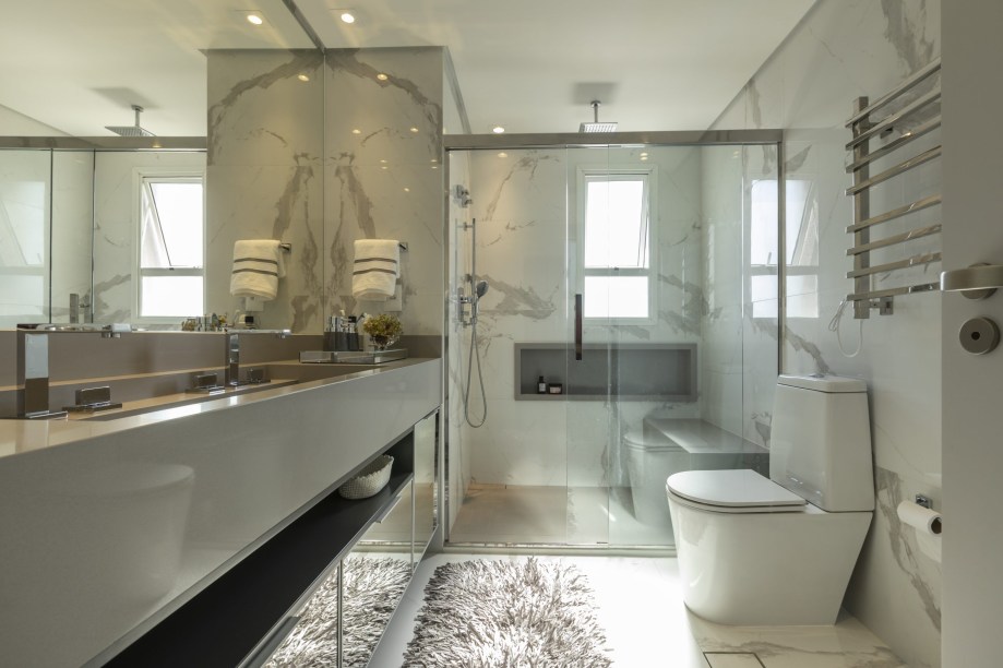 As entradas da cozinha, do closet do casal e do banheiro de funcionário também foram realocadas. Com o foco de integração da principal área do apartamento – sala e varanda gourmet de pé direito duplo – foi feito o nivelamento dos pisos.