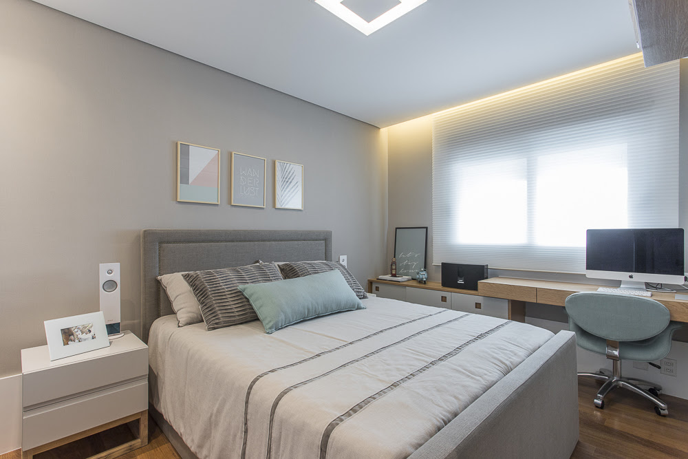 Por causa da crescente necessidade de trabalhar em casa, os projetos estão privilegiando a presença de um escritório organizado. Assim, muitos moradores preferem montar esse espaço no quarto, local mais reservado e calmo. “Quando incluímos o home office no quarto sempre recomendo que ele seja mais leve: um apoio para o notebook e algumas gavetas para os documentos. Isso impede que um ambiente tão relaxante seja descaracterizado”, aconselha Roberta.