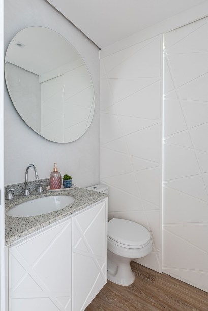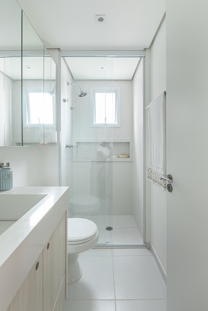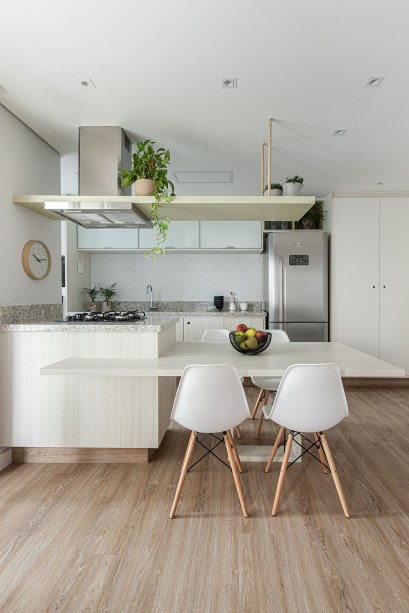 A tonalidade branca e cinza toma conta de todo o imóvel que, aliado à integração de ambientes, promoveu uma maximização dos espaço e maior incidência de luz natural.