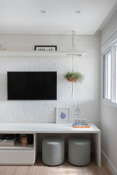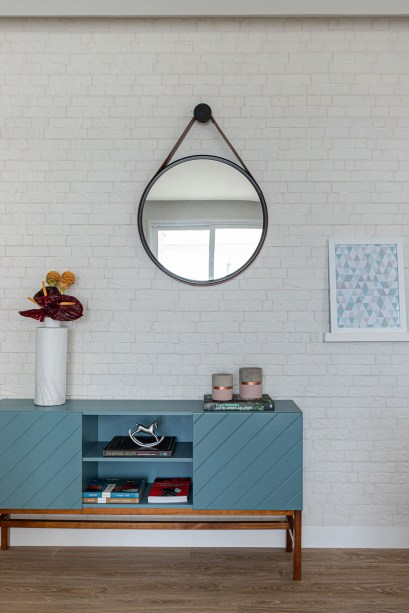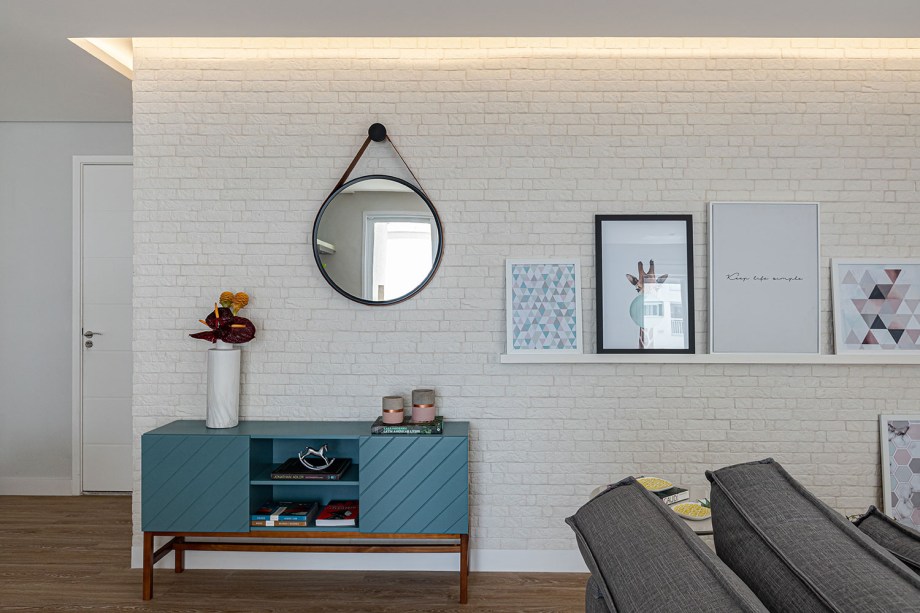 Ainda na área de convivência, destaque para a parede da TV, que foi revestida com um material cimentício de tijolinhos irregulares – o mesmo acabamento é usado no corredor que ganha ainda sanca iluminada em todo o seu comprimento.