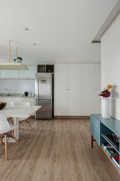 Pitadas de cores são expressas em alguns detalhes da morada, como no aparador da sala e o verde clarinho nos armários da cozinha.