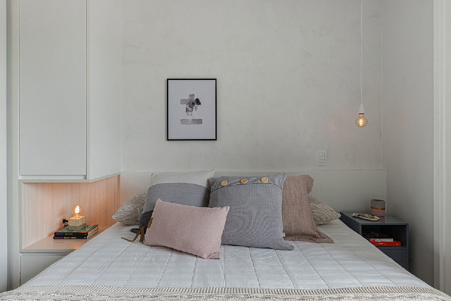 Por fim, na suíte, está um dos charmes do projeto. Nela, foi feito um armário em L com uma mesa de apoio embutida. Detalhe: o revestimento da parede é marcado por um cimento queimado cinza bem clarinho, complementando toda a atmosfera minimalista e industrial repaginado do apê.