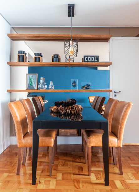 Ainda no estar, foi inserido um painel de madeira, que possui iluminação embutida na sanca, conferindo sensação de aconchego. Enquanto isso, a parede principal do espaço recebeu pintura em um tom de azul forte, agregando mais personalidade à proposta; e a cozinha ganhou um décor mais clean, com base branca e detalhes em granito preto.