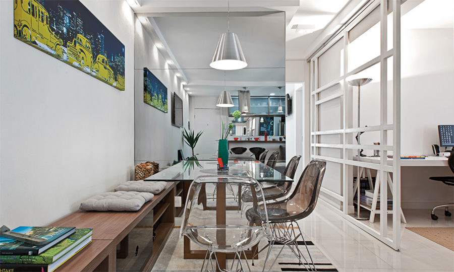 O espelho dá sensação de profundidade e amplia o espaço. Para não pesar no ambiente, o morador escolheu uma mesa com tampo de vidro e base de madeira em cruz. Seguindo a proposta de leveza, as cadeiras são de acrílico incolor e preto. Projeto de Daniel Tesser.