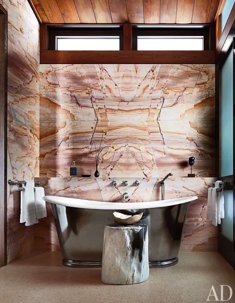 16/41Painéis de pedra indianos envolvem a banheira.(Tim Street-Porter/Architectural Digest)