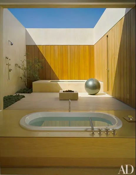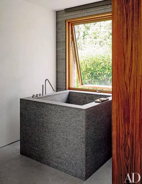 40/41Uma banheira de imersão japonesa feita sob medida é a peça central neste espaço.(Reprodução/Architectural Digest)