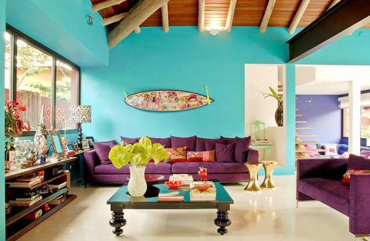 Tons de azul e roxo combinam muito bem entre si. Experimente acrescentar almofadas em nuances de laranja e ocre, matizes quentes que se harmonizam lindamente com os azuis. Vale lembrar, porém, que o sofá é uma peça grande, ou seja, o revestimento turquesa chamará a atenção e poderá cansar em pouco tempo.