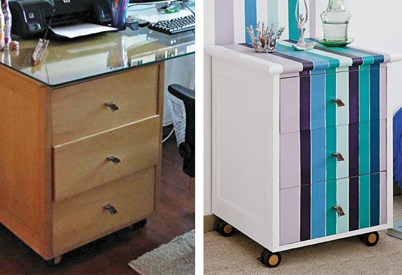 O antigo gaveteiro de pau-marfim já tinha pertencido a um escritório de advocacia antes de ir parar no home office. Ali, era útil sob o tampo de vidro da escrivaninha, mas acabou sem função quando a área foi modernizada. Então surgiu a ideia: em vez de descartar o móvel, por que não usá-lo como cômoda no quarto? Bastou um pouco de dedicação para substituir o visual sem graça por uma estampa descolada. A pintura de listras exige paciência porque é preciso esperar cada uma delas secar antes de passar para a próxima, mas o resultado vale a pena. “Para um efeito ainda mais surpreendente, estenda as faixas à parede”, ensina o repórter visual Mario Mantovanni, autor da transformação. Confira também como ficou uma cristaleira renovada com papel de presente.