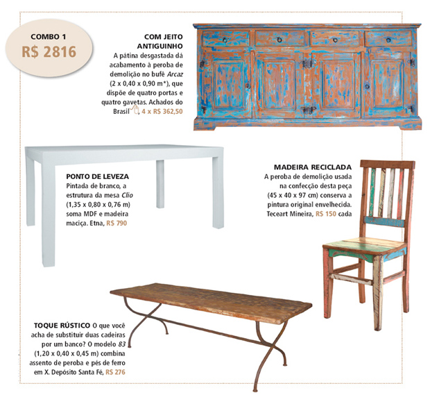 Montamos quatro conjuntos com mesa, cadeiras e bufê: escolha o combo que mais se adapta ao seu gosto - rústico, básico, descolado ou clássico - e bolso.