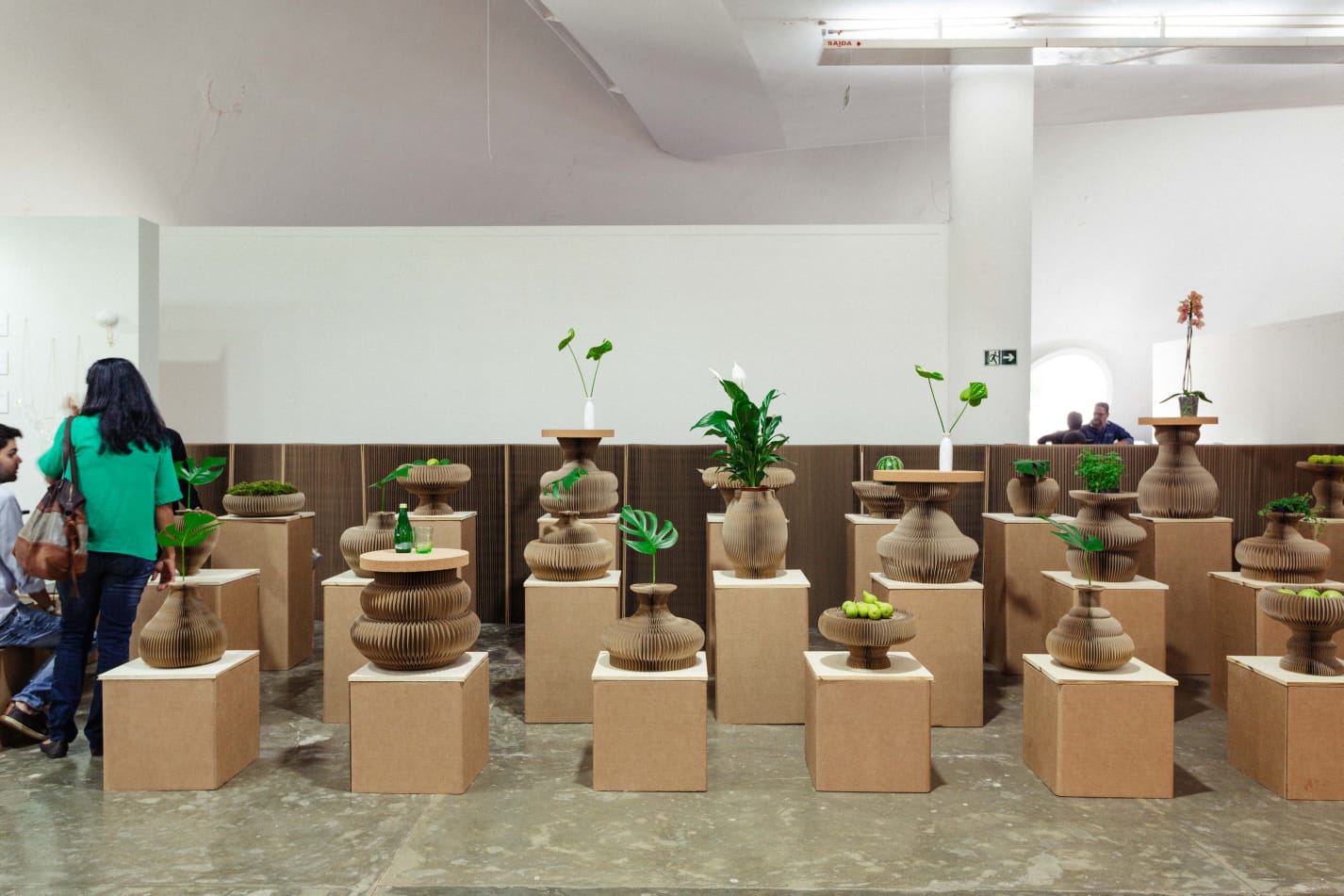 E o design é lindo! Beatriz conta que a ideia do sanfonado veio ao ver um sofá articulado. Esse tipo de papelão é originalmente para miolos de portas, mas foi perfeito para criar uma coleção de cadeiras, vasos e divisórias cheias de personalidade e muito versáteis. Agora, a marca dá um passo além e começa a entrar no mercado da decoração.